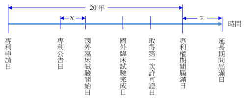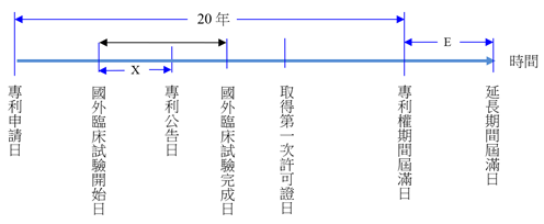由於國外臨床試驗開始日晚於專利公告日,專利公告日至試驗開始日前之期間(X)不計入得核准延長期間(E)。