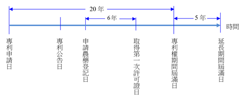 申請農藥登記之日在專利公告日之後,至取得第一次許可證之期間超過5年。