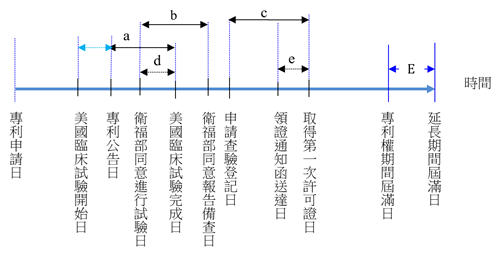 = 國外臨床試驗期間(a) + 國內臨床試驗期間(b) + 許可證之審查期間(c) - 美國臨床試驗期間與國內臨床試驗期間之重疊期間(d) - 可歸責於申請人之不作為期間(e)(E≧5者,仍以5年為限)