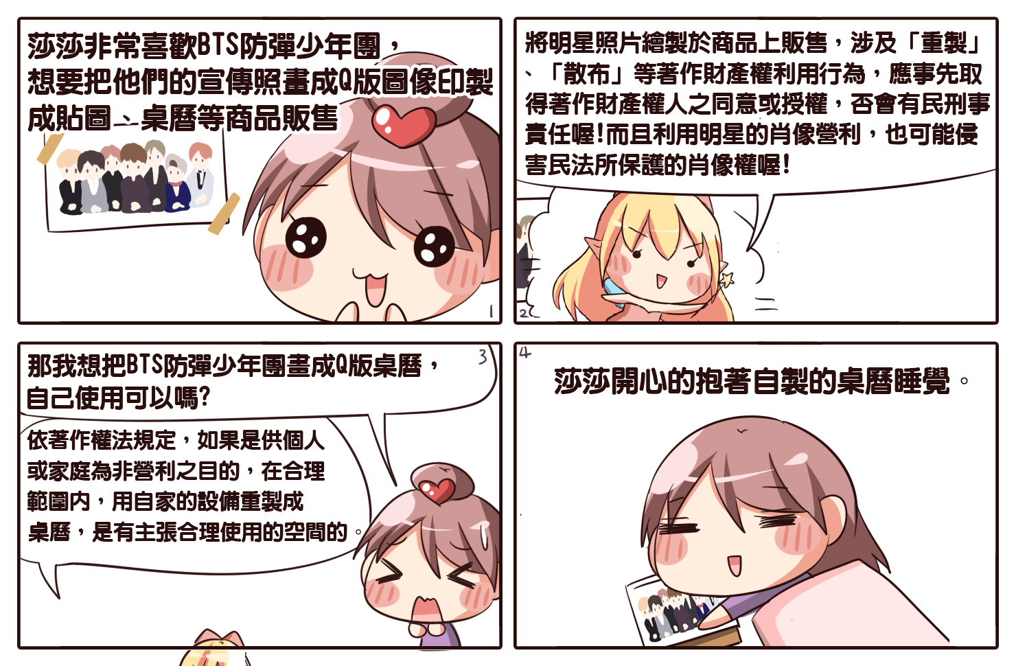 - 針對各個熱門著作權議題及新興之網路利用著作行為,以「轉傳LINE的長輩圖的著作權問題」、「網拍使用他人商品圖」、「著作權司法判決案例分享」及「把明星照片繪成Q版圖像會侵害著作權嗎?」等網友關心之著作權議題,製成生動活潑之四格漫畫、配音動圖及影音短片等網路文宣,上傳「原創我挺你」臉書粉絲團,總計達60篇,觸及人數逾39,000人,有效提升民眾之著作權觀念,並吸引民眾加入、關注本局社群。