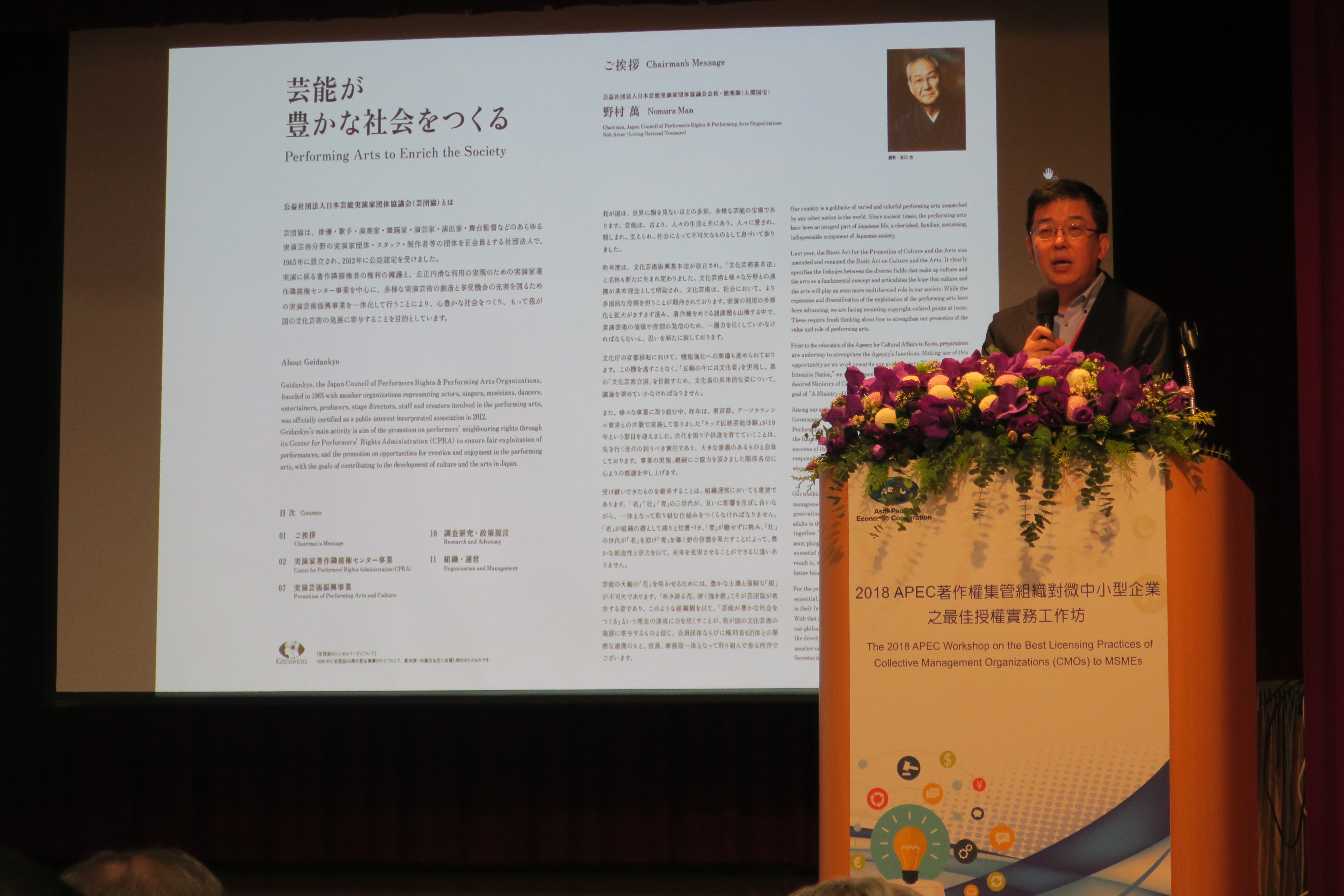 鑒於數位時代的來臨,各行各業都希望能更便捷、合法的利用著作,為協助APEC各經濟體的著作權集體管組織,能對分散而廣大的微中、小企業(即小店家、門市等)發展出有效率的授權管道,本局首度爭取執行APEC計畫,於10月23日及24日邀請日本、韓國、澳洲、越南等國實務專家分享各國集管組織發展授權模式的概況與最新發展趨勢,及來自APEC 13個經濟體共27名代表一同參與,獲得APEC各經濟體一致的好評,計有國內集管從業人員、微中小型企業人員與政府相關單位人員共逾300人次參加。會後並編製「2018著作權集管組織對微中小型企業最佳授權實務指南」供各界參考利用。