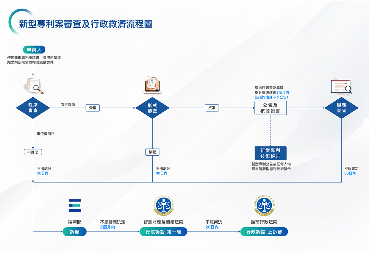 1. 新型專利申請案經形式審查為核准者,申請人應於處分書送達3個月內,繳納證書費及專利年費後,始予公告。 2. 新型專利申請案經形式審查為核駁,申請人對於處分有不服者,得依法於處分書送達後30日內提起行政救濟。 3. 新型經公告後,任何人均得申請新型專利技術報告。