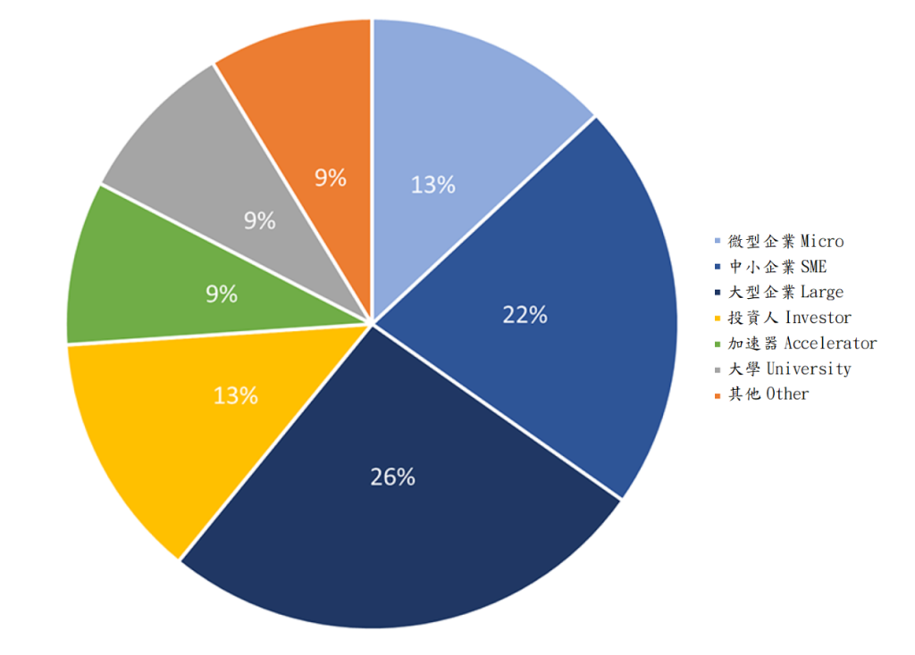 本研究從(1)中小企業、(2)大型公司法人、(3)學術界、(4)加速器與新創機構及(5)投資人等不同群體中篩選利害關係人,進行面對面訪談。總計篩選出96位來自不同企業和組織的個人,其中有34人回應,21人接受訪談,整體回應率接近22%。超過一半(61%)的受訪者為企業,13%為投資人,而投資人包含天使投資人(angel inventor)、創投(venture capital)和企業創投(corporate venture)。