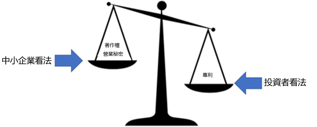 大多數創投投資人希望看到公司具備專利,而企業投資者則對技術及團隊比較感興趣。許多中小企業認為專利很重要,因為專利能吸引與滿足投資者。然而,著作權或營業秘密等其他權利卻較少被投資者所認識,尤其是創投。