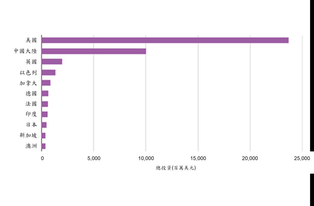 - 3. AI的發展及後續的投資絕大多數都集中在美國及中國大陸。然而,僅就歐洲的狀況觀察,英國正引領著AI發展活動和投資。