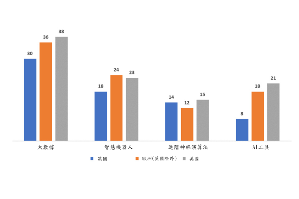 圖2 根據企業採用AI的比例(%)呈現英國、歐洲、美國之AI技術擴散