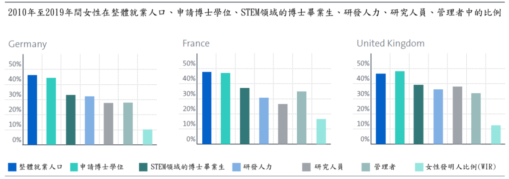 圖4 2010年至2019年間女性在整體就業人口、申請博士學位、STEM領域的博士畢業生、研發人力、研究人員、管理者中的比例