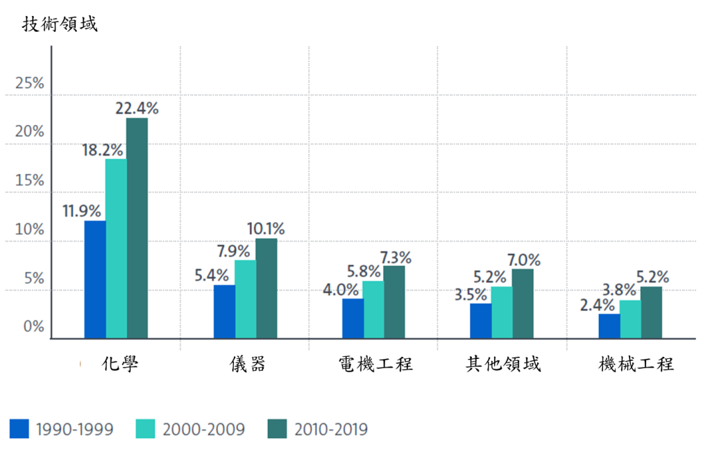 - a. 在五大技術產業中,化學的女性發明人比例最多。2010年至2019年間,化學產業的女性發明人占比超過22%;其他產業的占比則分別為:儀器(Instruments)10.1%、電機工程3%、其他領域7.0%、機械工程5.2%。此外,在化學產業中,又以生物科技(30.7%)和製藥(30.2%)的女性發明人占比最高,化工(10.8%)、環境科技(9.2%)則最低。