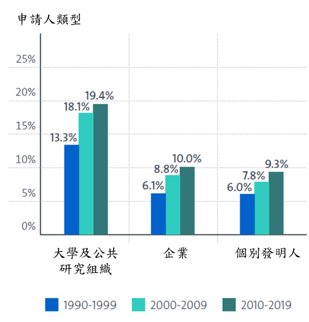 報告也指出,在大學和公共研究組織的專利申請案中,女性發明人的比例(2010年至2019年間占比19.4%)明顯高於私人企業(10.0%)。