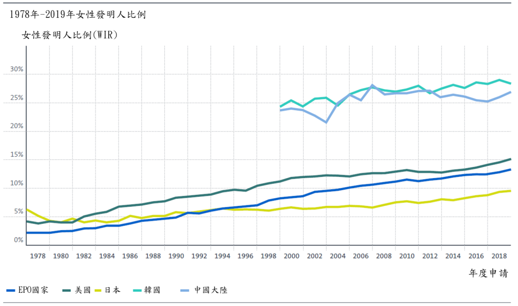 - 1. 女性發明人比例隨著時間穩定成長,但仍遠低於男性。在EPO的38個成員國裡,女性發明人比例(women inventor rate,簡稱WIR)自1970年代末占比2%,至2019年占比超過13%。