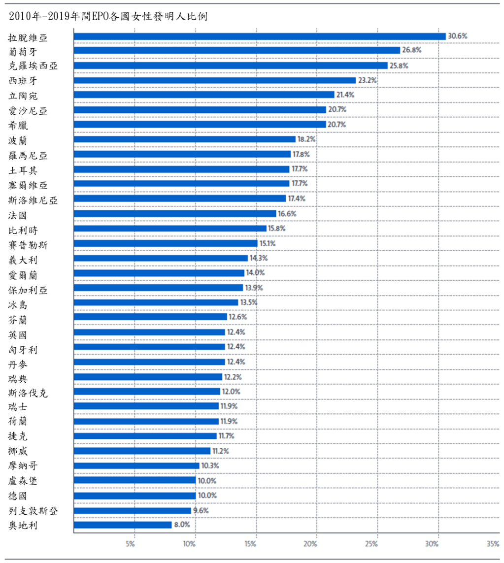 在EPO成員國中,2010年至2019年間,女性發明人占比最高的國家依序為:拉脫維亞(30.6%)、葡萄牙(26.8%)、克羅埃西亞(25.8%)、西班牙(23.2%)和立陶宛(21.4%);然而,德國(10.0%)、盧森堡(10.0%)、列支敦斯登(9.6%)和奧地利(8.0%)則敬陪末座。